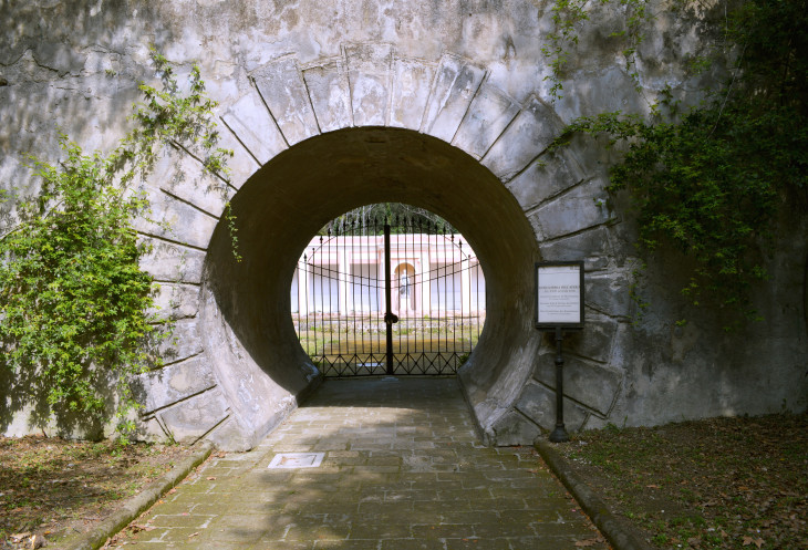 Проходим по тропинке дальше и видим Аперию – сейчас это открытый театр, а ранее была пасека, при французах здесь разводили пчел. Летом там проходят разные мероприятия, а сейчас ворота закрыты. Можно посмотреть только сквозь решетку.
