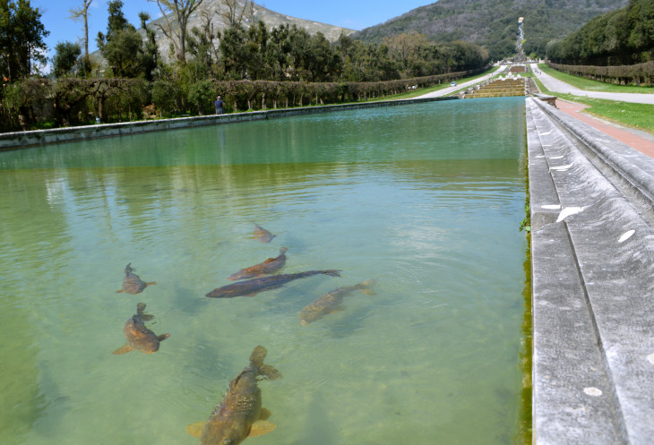 Правда в этом фонтане дельфины не являются дельфинами. Странный зверь, с когтистыми лапами, в середине композиции, называется Морским монстром. Водяные струи падают с высоты около 3 метров в бассейн длиной 470 метров и шириной 27 метров. За скалой с дельфинами находился грот для романтического уединения. В 1781 по указу короля Фердинанд IV сделали специальное освещение дороги от дворца до фонтана Дельфинов, чтобы можно было беспрепятственно добираться сюда даже ночью.
