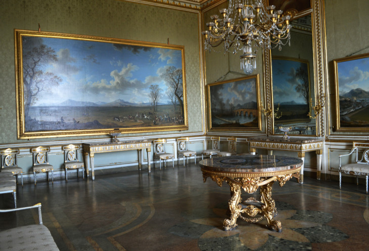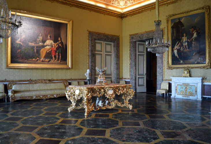 Сплошное золото на белом фоне, высоченный потолок с огромной фреской. Узорный мраморный пол, гербы с названиями провинций и медальоны с портретами неаполитанских монархов. И позолоченный королевский трон, изготовленный из дерева в начале 19 века, неаполитанскими мастерами. Правда трон на фоне гигантского зала кажется каким то несолидным. Над троном — изображение Славы.