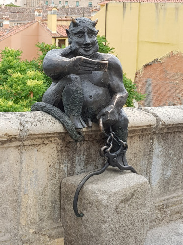 По легенде при строительстве акведука не обошлось без помощи чёрта.Хотя,на мой взгляд,эта легенда не может быть достоверна- какие черти в местах дислокации римских легионеров.Но,черти,видимо,держатся противоположной точки зрения и один из них теперь делает сэлфи на фоне давно законченной стройки.