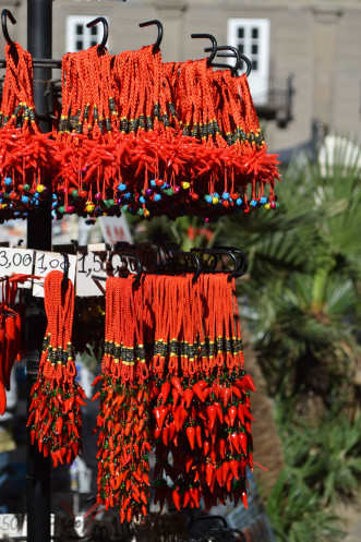 Перчик чили это вовсе не перчик, а...рог! Итальянское название этого амулета - корничелло, то есть "рожок", еще одно название переводится,как рог приносящий удачу. И связан этот талисман вроде с античным мифом с рогом божественной козы, вскормившей Зевса. Но, углубившись в недра интернета, я узнала, что и рог, совсем не рог, а не что иное как фаллос! Оказывается мужской орган на юге Италии считался суперталисманом для привлечения удачи. Во время битв римские солдаты и военачальники носили на шее амулеты в форме фаллоса, орган часто был с парой расправленных крыльев. Такой же оберег подвешивали и на лошадей, чтобы тоже уберечь их от врагов. И это оказалось не удивительно, ведь в те времена мужское начало в обществе всячески превозносилось. И мы в этом уже убедились, побывав в Помпеях, Геркулануме и Археологическом музее, где хранится не мало подобных талисманов.