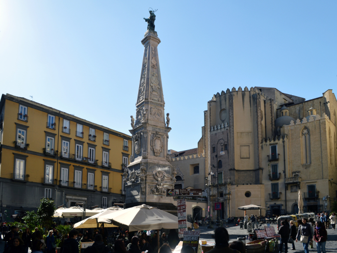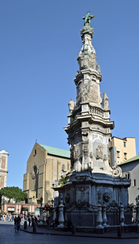 Идем дальше. Следующая площадь - площадь Джезу Нуово ( Нового Иисуса). Площадь окружают исторические здания, в том числе базилика и монастырь Санта-Кьяра, а напротив иезуитская церковь Джезу Нуово. А в центре площади расположен 30-метровый мраморный обелиск Иисуса, также известный как обелиск Непорочного Зачатия.