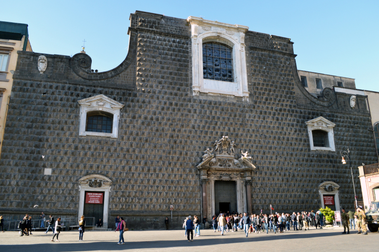 Здание церкви Джезу Нуово было построено в конце 15 века как дворец для первого принца Салерно, но уже через сто с небольшим лет было продано иезуитам вместе с садами. Иезуиты и перестроили светское здание под церковь, оставив только необычный фасад.