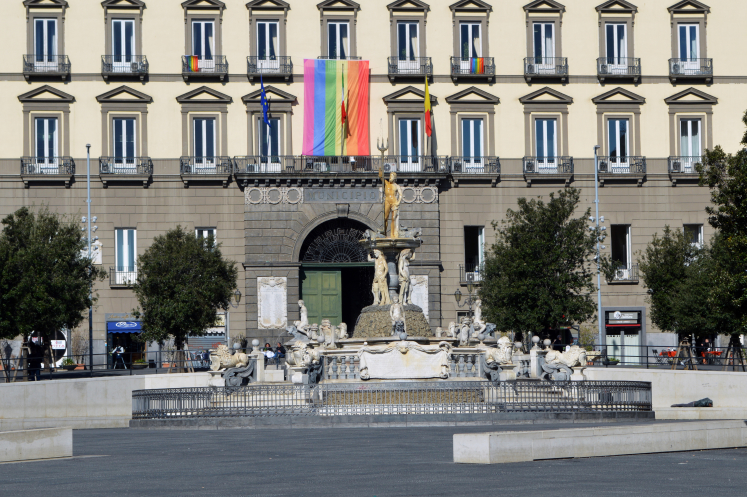 Утро следующего дня мы начали на Муниципальной или Ратушной площади. Сначала смотрим на фонтан Нептуна, расположенный напротив Муниципалитета. Здание Муниципалитета интересным образом совмещено с церковью Сан-Джакомо-дельи-Спаньоли, построенной в 16 веке. Что то там происходило - видите на здании Мэрии висит флаг ЛГБТ?