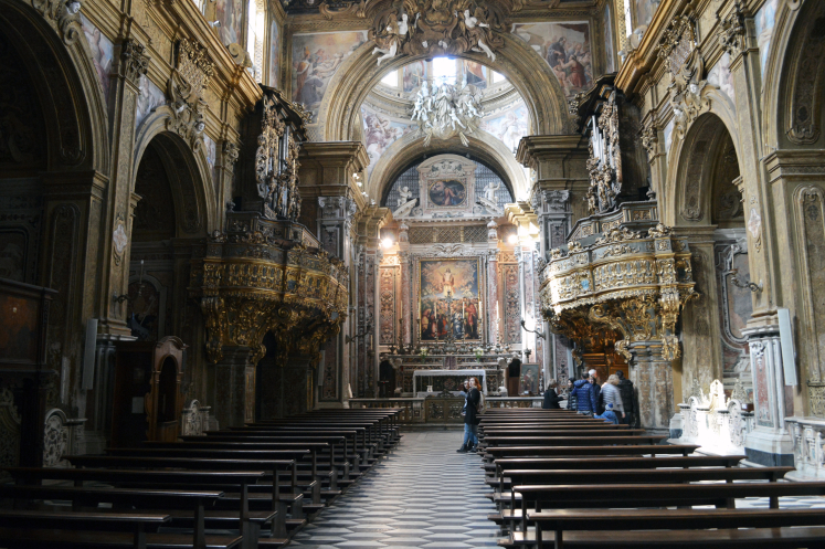 Внутри церковь, оформленная в стиле барокко, производит сильное впечатление.