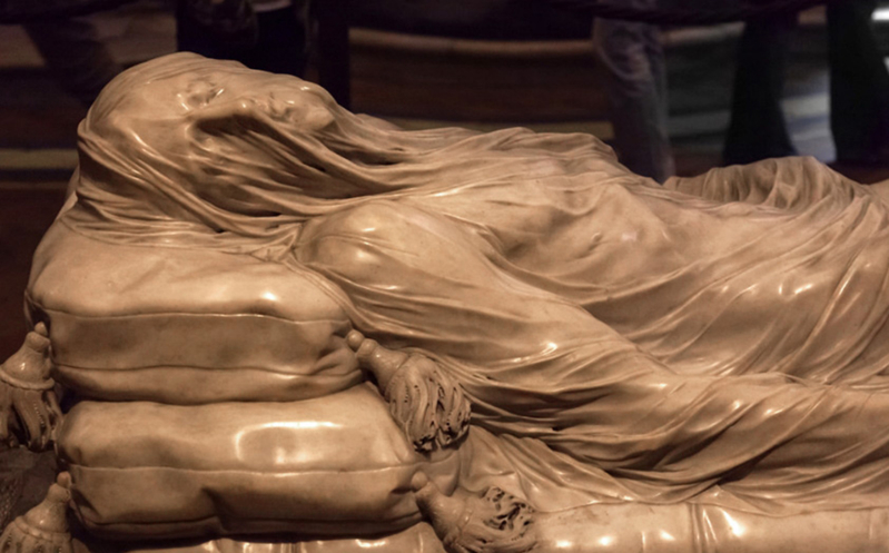 Князь Раймондо был уникальным человеком - он был ученый, алхимик,изобретатель. В крипте капеллы выставлены в стеклянных витринах мумифицированные тела мужчины и женщины. В их телах сохранилась вся кровеносная система. Легенды говорят, что князь напоил двух своих слуг перед смертью какой то жидкостью, изобретенной им. Под ее действием сердце, артерии и вены окаменели и таким образом сохранились до наших дней. Верится в это с трудом и зрелище не из приятных. Поэтому быстренько взглянув на чудо, мы вернулись наверх, чтобы по второму кругу поразглядывать мраморные шедевры.