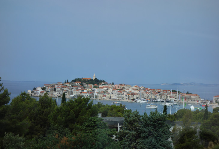 По дороге к водопадам Крки проезжали мимо очень живописного городка Примоштен. Такой уютный с виду старинный городок, расположенный на полуострове. Сфотографировала через стекло автобуса.