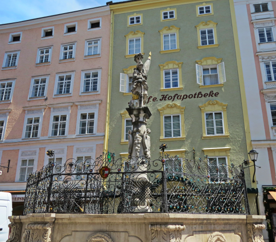 Фонтан Пегас, Pegasusbrunnen, установленный в 1913 году, автор Каспар Грас из Инсбрука. Фонтан посвящен крылатому коню Пегасу – символу поэтического вдохновения.
