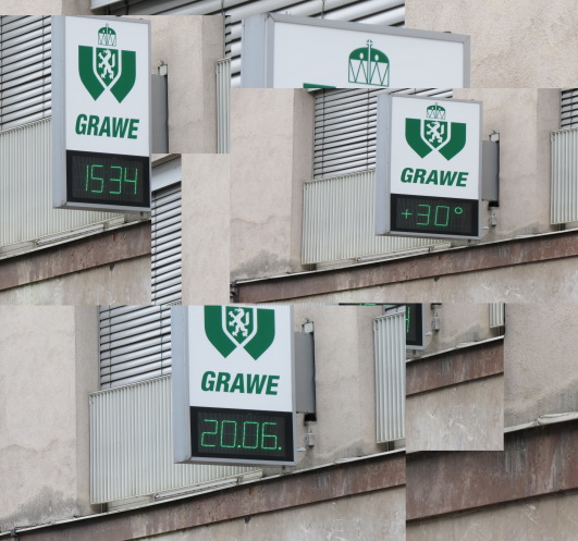 На одном из зданий я заметила термометр. Чтобы было понятно, как было "не жарко", сделала коллаж: 20 июня, время 15-34, температура +30.