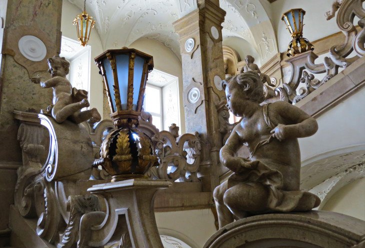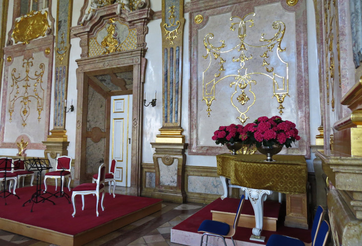 Здесь музицировала семья Моцартов. Сегодня он стал залом для романтических бракосочетаний с мировой известностью. Богато украшенная ангелами и херувимами парадная лестница.