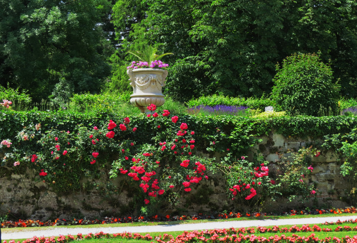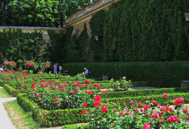Летний театр, окаймлённый живой изгородью, один из старейших в Европе; Сад гномов с необычными скульптурами маленьких человечков; Сад роз расположен вдоль южной стены Мирабель, роз в парке просто обилие!