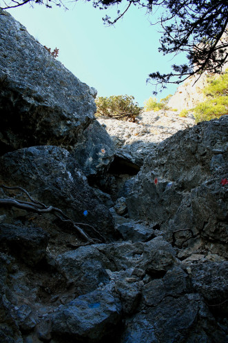 ...Последний небольшой подъем по сыпучему склону - и вот уже мы оказались наконец-то не на скучной тропе, а в каком-то очень интересном месте! Этот узкий проход между скалами был словно калитка в сказочную страну... страну тавров! Самые диковинные вещи этих мест ждали нас впереди - Лестница тавров и лабиринт тавров, ущелье Адамово ложе и собственно Пик Космос.