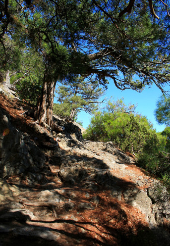 ....а дальше начинаешь идти чисто интуитивно, ориентируясь "по горам" двигаясь в направлении Можжевеловой рощи. Гора Коба-Кая, рядом с которой вход на тропу Голицына, должна оставаться четко слева. Если по пути к роще вы проходите через двор 5-этажного жилого дома, и этот дом - справа, значит - идёте верной дорогой)) Перед самой можжевеловой рощей дорога начинает подниматься "в горку". Ещё минута - и мы входим в эту новосветскую сказку с дивным воздухом и не менее дивными видами!