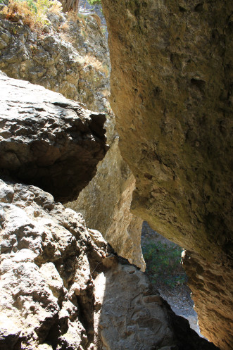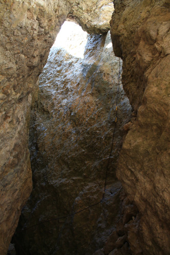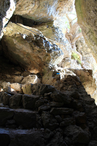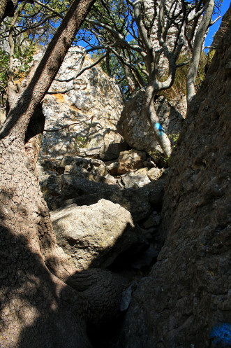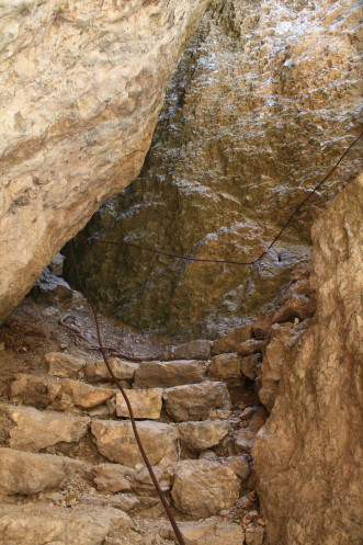 А потом бочком-бочком, обняв большой камень, который был слева, я полезла по каменной лестнице дальше. Провал под ногами остался позади, дальше был просто небольшой подъем в очень узком проходе между скалами...