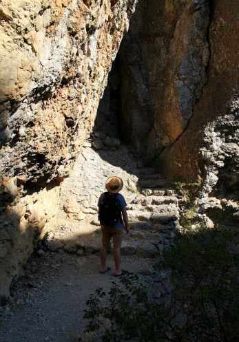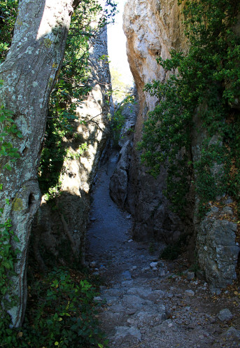 Стены, увитые плющом, приятная прохлада... В жаркие летние дни здесь можно хорошо передохнуть после долгого перехода. Но в тот сентябрьский день температура воздуха была очень комфортная для горных прогулок, и поэтому мы по этому ущелью буквально "пролетели", предвкушая скорое достижение цели. Несколько десятков метров - и снова небольшой подъем наверх...