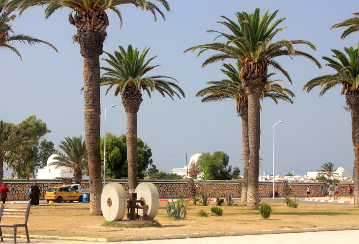 [перед кладбищем примостилось какое-то непонятное сооружение - два каменных колеса: действительно, если подключить воображение, видно, что это гироскутер для пальмы, к счатью для нашей нервной системы и состояния психики, днём пальмы в Монастире предпочитают вести статичный образ жизни]