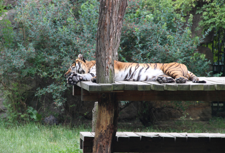 Огромная львиная территория впечатляет: хорошо рассмотреть царя зверей можно только в объективе камеры. Тигр и гепард ленятся на своих лежанках.