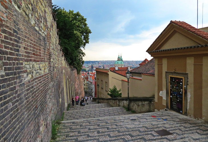 На входе в Райский сад висело объявление, суть которого была понятна: сад закрыт по техническим причинам, идёт обрезка деревьев и санитарные работы. Нет, я не знаю чешского, но некоторые слова можно было понять и сложить их в понятный смысл. Пришлось идти дальше, спускаясь вниз по новой замковой лестнице. Новая дворцовая лестница