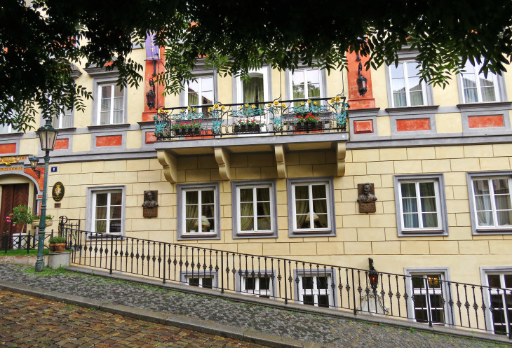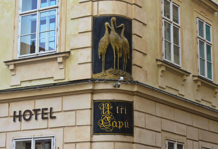 Недалеко, чуть правее, интересный дом «У трёх аистов», Фасад его выходит на Вальдштейнскую площадь.