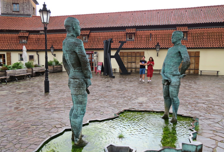 Вступив в двор музея, посетитель (т.е. это Я) ошеломлён фонтаном чешского эпатажного скульптора Дэвида Черны, расположенном во дворе. В мелком бассейне, очертания которого совпадают с контурами Чехии на карте Европы, установлена пара бронзовых скульптур обнажённых писающих мужчин.