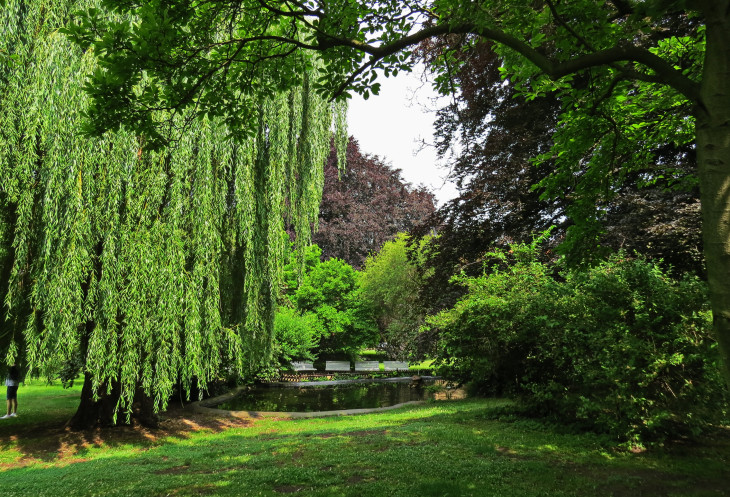 В парке, рядом с прудом и фонтаном, есть прекрасный розарий