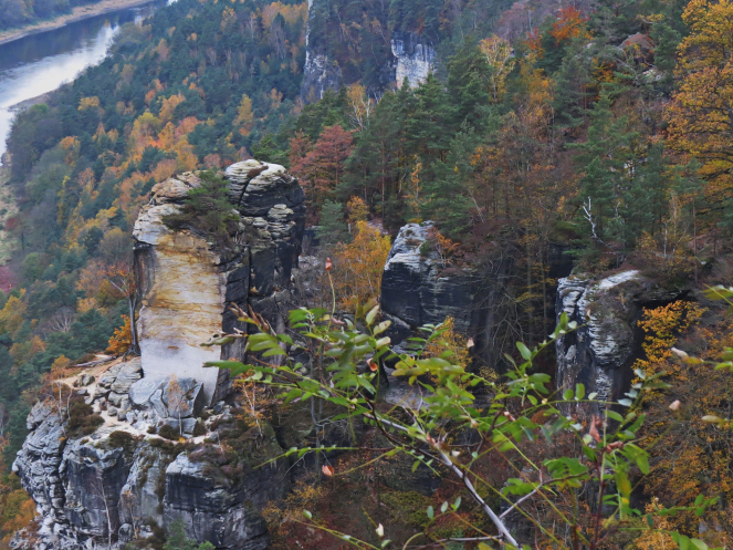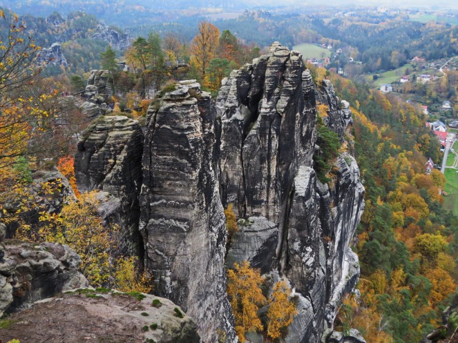 Скалы Бастай очень популярны у скалолазов. Сейчас для них маршруты сильно ограничили, т.к. песчаник по-тихоньку разрушается и горы рушатся. Примерно так, как скала Варттурм, от которой откололся крупный кусок породы.
