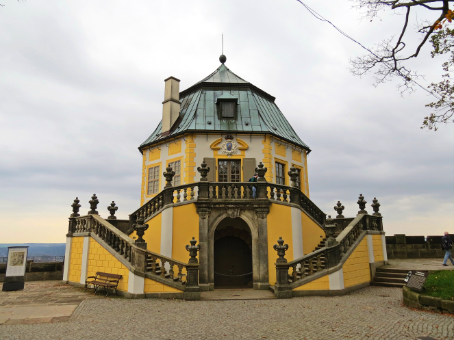 Особняком стоит замок им. Фридриха, или павильон Фридрихсбург. Построен в 1589 г. как наблюдательная и фланговая вышка. Первоначально на нижнем этаже размещалось орудие, верхний этаж использовался как праздничный зал, в 1731 г. перестроен в павильон в стиле барокко. Интересно, что стол для этого зала находился на нижнем этаже, откуда, груженный всевозможными яствами, поднимался с помощью специального механизма на верхний. Cегодня павильон Фридрихсбург- это бюро ЗАГСА и используется как зал торжеств.Замок Фридриха в крепости Кенигштайн