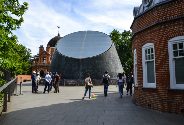Для того, чтобы пройти в ту половину, где «располагается» нулевой меридиан и сама обсерватория, нужно будет раскошелиться на 14 с небольшим фунтов (если покупать билеты онлайн). Не берусь судить, насколько интересна обсерватория, но большинство людей идут туда именно ради нулевого меридиана. Желающих сфотографироваться около монумента, символизирующего земные оси, и металлической полосы, указывающей на нулевой меридиан, всегда хоть отбавляй.