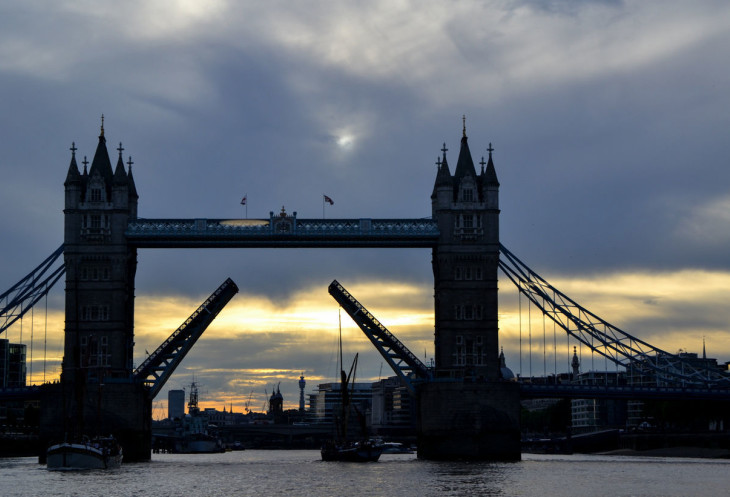 Подъезжая к Тауэрскому мосту, мы с удивлением и радостью обнаружили, что он разведен. Буквально перед нами там проходил большой парусник и нам посчастливилось видеть мост в действии. Сходились его половинки уже на наших глазах, когда мы под ним прошли.