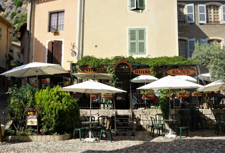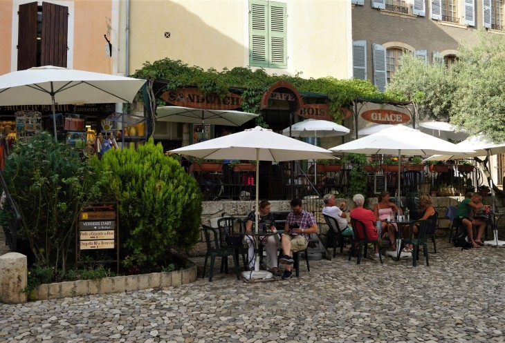 Деревня славится также местным оливковым маслом, тапенадами (пастами из измельченных оливок, вяленых томатов, артишоков и других овощей, которые едят, намазав на хлеб), лавандовым медом, овечьим сыром и вяленым мясом. Каждый из нас закупился по своему вкусу в магазинчиках, и мы зашли в милое кафе выпить кофе.