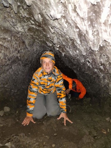 Пока ехали три часа туда, три часа сюда более-менее просохли и уже готовы к новым подвигам. По дороге еще проезжаем по самым интересным местам старых извержений. Сначала - на сопку Звезда, это извержение какого-то уже достаточно старого года, точно мы так и не выяснили. В этой сопке есть длинная лавовая пещера, которая ведет снаружи в кратер. Такая узкая, что ползти приходится на четвереньках.