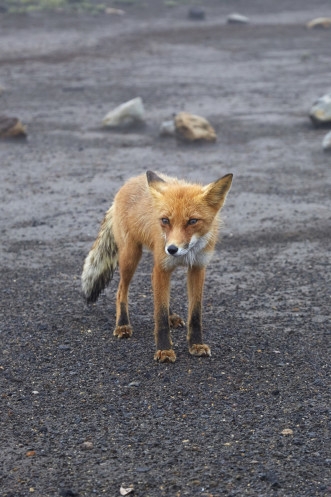 Поплутали в тумане, который то сгущался, то ненадолго развеивался, и все-таки вышли к стоянкам рядом с Мутновским вулканом. Пришли мы на ту стоянку уже уставшие и не очень впечатленные. Да и сырость эта настроения не поднимает. Кажется, что пока солнца не будет, и радоваться-то особо нечему. Но тут, раз, и очередное чудо Камчатки - к нам в гости пришла лиса. Мокрая от тумана и наглая от своей безнаказанности.