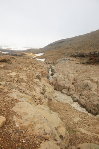 А по дороге ледник размывается кипящей рекой, получается какое-то месиво из воды пара и глины.