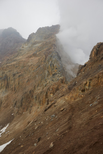 Но нет. Когда мы были уже перед самым верхом, набежали облака и все закрыли. При этом ветер так никуда и не делся. Поэтому, когда мы поднялись на кромку кратера, мы увидели только белую пропасть, которая извергается ураганным ветром.