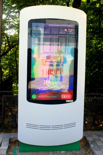 В тени притаился первый из «умных» информационных стендов, интерактивный… Такими стендами в буквальном смысле утыкан весь курортный Железноводск. Я листала несколько раз (в разных местах по разной необходимости), очень удобно и очень информативно. Очень приятно, соответственно.