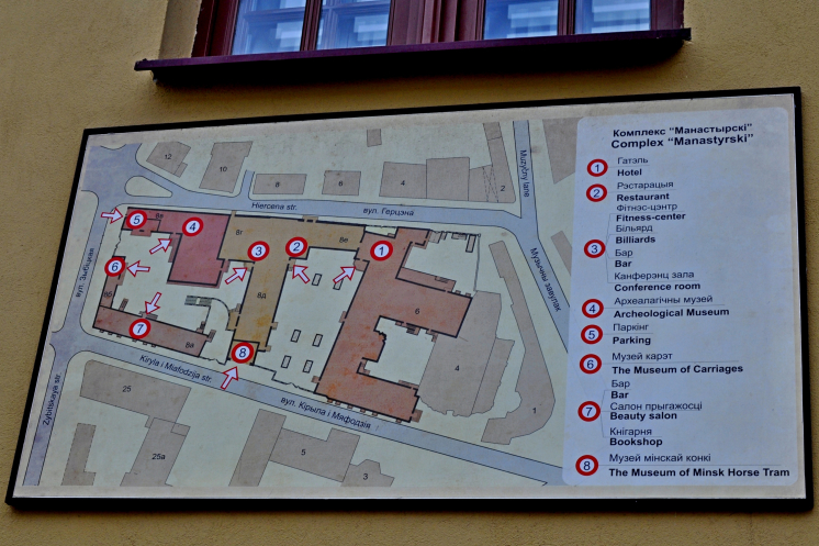 Дальше нужно нырять в подземный переход, он же вход на станцию метро «Немига», очень удобно расположенную для тех, кому ехать в центр издали. Пока что у минского метрополитена 2,5 линии, но всё, как говорится, впереди. В ближайшей перспективе должно полноценно заработать ещё полторы, всего 4 (четыре) линии. Ну а пока что через «Немигу» в Троицкое предместье: свернуть налево за Святодуховым собором, чтобы экс-костёл Св. Иосифа, а ныне архив остался по правую руку – все это – хозяйство бернардинцев, активно проповедовавших в Минске в XVIII в. Собственно Музей истории города в интересующей меня части занимает часть бывшего монастыря бернардинцев. По этой простой причине – запутанности проходов, я бы без карты на первый раз вход в музей не нашла, даже несмотря на навигационные указатели на белорусском и английском…