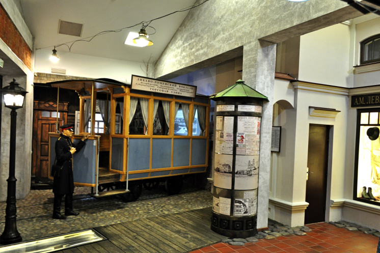Кроме того, представлены витрины популярных магазинов рубежа XIX-XX веков – магазин Левина, аптека Староневича, с экспонатами, конечно. Среди них внимание может привлечь абсолютно вся аптека с тенктурами и прочими флаконами и флакончиками, весами и… всем тем, чем, например, можно пустить кровь страждущему. И такие предметы женского туалета как ботинки верхние… безразмерного 43 размера, обуваемые поверх туфель дамских, например. По принципу калош. А также цилиндр «Шапокляк», работающий! Но демонстрировать мне отказались, потому что процесс вскрытия витрин затруднительный. Но цилиндр функционирующий, работники проверяли: легким ударом он складывается в таблетку и пригоден для помещения подмышку при вскакивании в вагон конки…