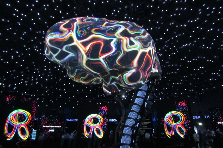 В центре зала пульсирует разноцветными огнями гигантский мозг, семиметровая кинетическая скульптура, главный элемент экспозиции «Механика чуда». Мультимедийное шоу повествует об устройстве человеческого мозга.