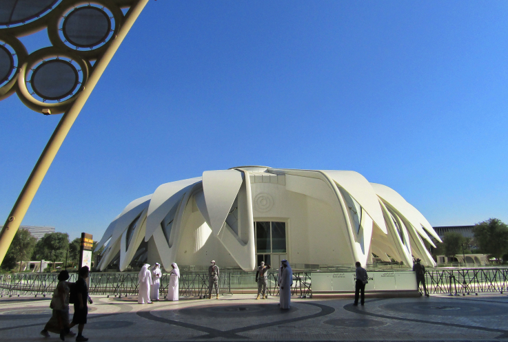 В первый день я туда не попала, павильон был закрыт по техническим причинам. Причина проста: накануне праздновали 50-ти летие образования страны, после грандиозного шоу надо было привести в порядок экспозицию. Павильон сделан в виде 28 крыльев сокола, сокол- национальный символ Эмиратов, изображён на гербе страны. На следующий день я подошла к павильону почти с открытия получила талончик на входе, пришлось подождать минут 5-7. Ждать было очень комфортно,