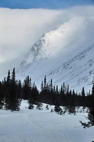 А потом же надо еще с этого перевала спуститься, снова до леса, чтоб ночью не улететь. На следующий день за следующим углом новый перевал. Погода все такая же, странная. Небо и видимость есть строго у нас за спиной, а перед нами - ветер и снег. И мы как ледоколы, прокладываем путь, среди этого месива, оставляя за спиной полосу хорошей погоды.