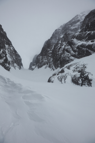 А потом что-то пошло не так. Внутри ущелья крупные снежные надувы, где перемежается, то снег, то жесткий наст и слои фирна. Приходится то забираться на надув, то скатываться с него вниз. Ветер по просто дует, а потом, раз, и порыв. И дует он совсем не обязательно вдоль ущелья, а куда угодно. И вот, один из таких порывов все таки сбил меня с ног. Одна лыжа выкатилась на жесткий надув, другая так и затормозила в рыхлом снегу и я упала, накрывшись сверху рюкзаком и фотоаппаратом. В коленке что-то мерзко хрустнуло и нормально работать она уже не захотела.