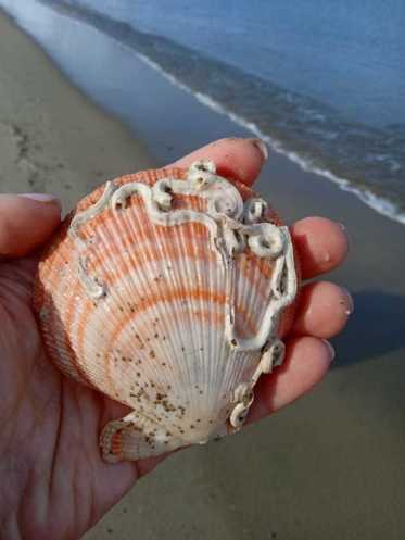 Ходим по берегу, собираем ракушки. Я вот такого красивого гребешка нашла.