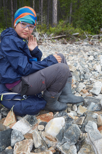 Но до полянки с княженикой нам ещё почти целый день идти. Идём мы по тропе. Там где она идёт по берегу, о тропе напоминают только стрелочки, которые кое-где нанесены на камнях. Потом в какой-то момент тропа уходит от берега в тайгу, там она уже настоящая тропа под ногами.