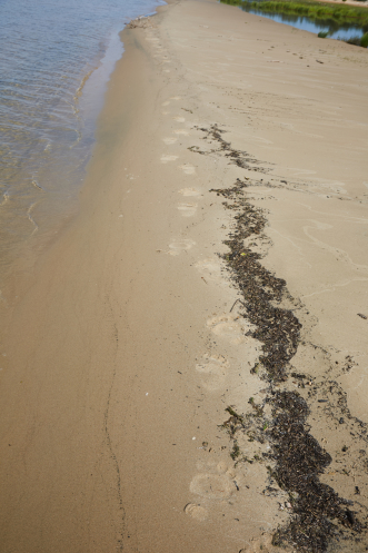 Начали мы не очень удачно. Мелкие заливы и болотца то тут, то там рассекают песчаный берег и очень легко заблудиться. Вот мы и начали с того, что потеряли тропу. Полазили по болоту. Потом всё-таки нашли оранжевый указатель и пошли вперед.