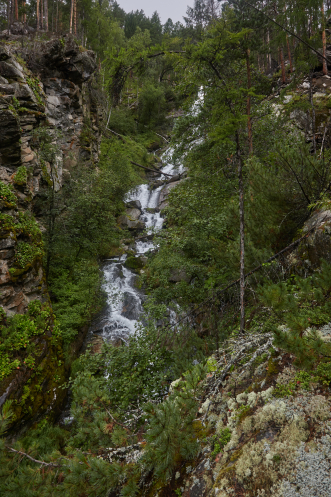 К водопаду надо немного подняться, а потом он открывается. Высоченный, метров 40, наверное. Как-то точной информации о нем не нашла. Стены обросшие мхом, брызги и отдельные струи - красота!
