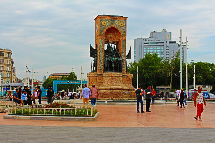 Площадь Таксим встречает меня хорошей погодой и известным 12-ти метровым памятником "Республика", где наряду с обожаемым в Турции вождём Ататюрком, стоят наши Климент Ворошилов и Семён Аралов. Эта история описана во множестве источников в интернете и кому интересно её можно легко найти.