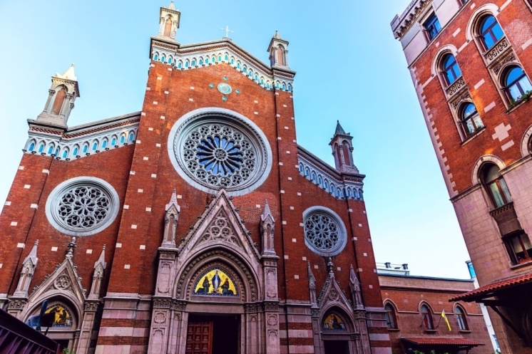 Храм построен в начале ХХ века в венецианском неоготическрм стиле по проекту итальянского архитектора Джулио Монджери. Из-за особенностей постройки церковь оказалась внутри обширного двора и пройти к ней с улицы Истикляль нужно через красивую стрельчатую арку. Я осмотрел храм и посидел нём недолго.