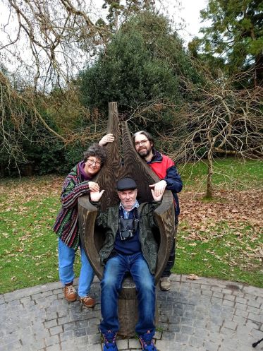 На небольшой площадке для отдыха наткнулись на оригинальные сиденья, сделанные целиком из стволов деревьев. По нашей просьбе мужчина, отдыхавший в этом месте, сделал «семейный портрет».