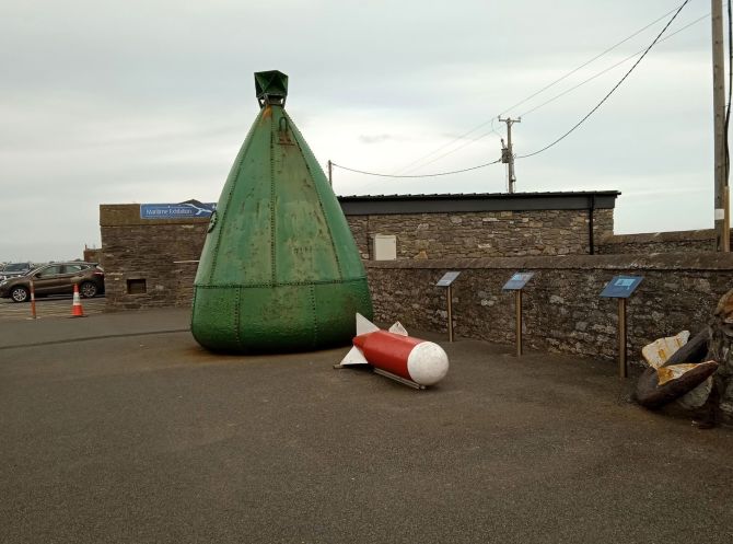 Меня вполне удовлетворил вид с обзорной площадки в сторону моря. Костя нафоткал рукотворные морские достопримечательности, установленные во дворе. Это были, как я понял большой металлический буй, устройство в виде небольшой торпеды для траления и вполне узнаваемые гигантские якоря на вид весьма почтенного возраста.