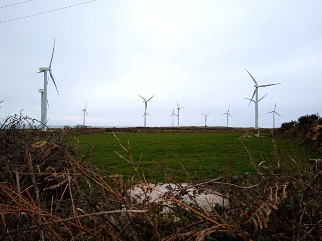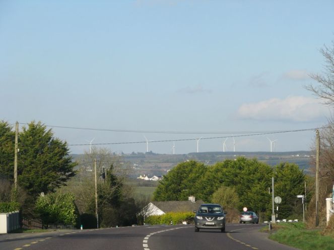 Вторая плановая достопримечательность – «гнездо ветряков», к которому мы «подбирались исподтишка» - так нас вёл навигатор по истинно Ирландским дорогам. Как правило, к каждому отдельно стоящему дому, а их большинство в сельской местности, вела собственная асфальтированная дорога. Но ширина этих дорог - в одну колею, и по обочинам, как правило – зелёные насаждения, скрывающие «что там за поворотом». Поэтому к каждому повороту дороги мы приближались с тайным страхом – а вдруг из-за него вылетит встречный автомобиль. Навигатор привёл к 14-ти ветрогенераторам, стоящих кучно среди полей, этими просёлочными узкими дорогами.